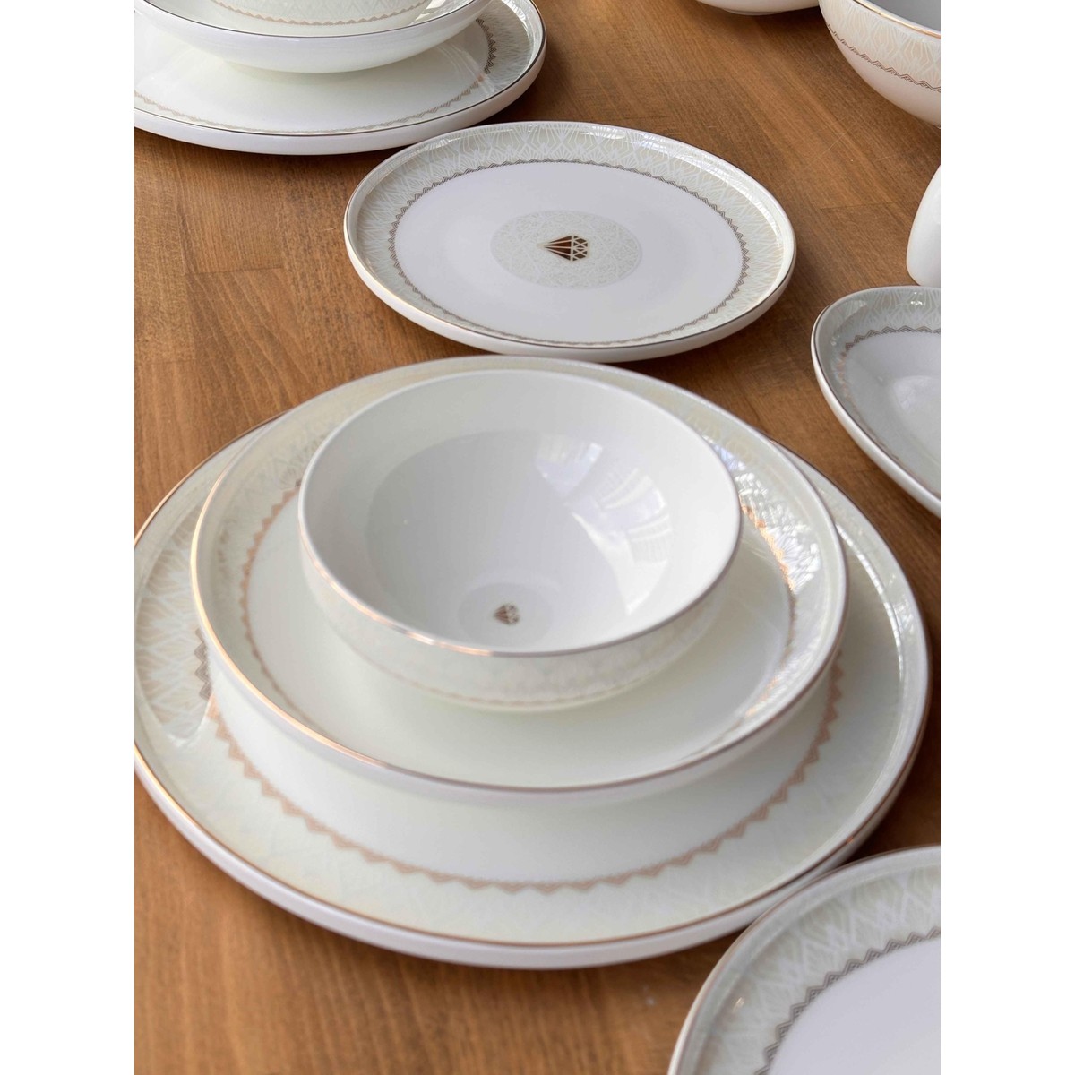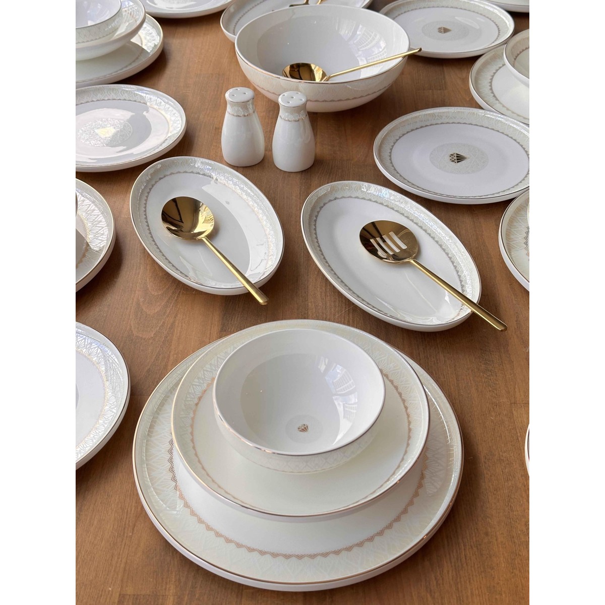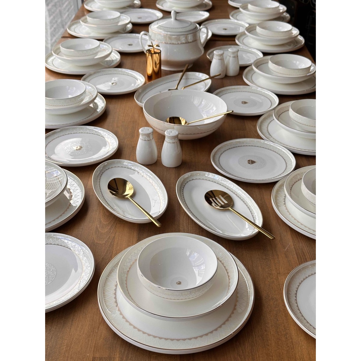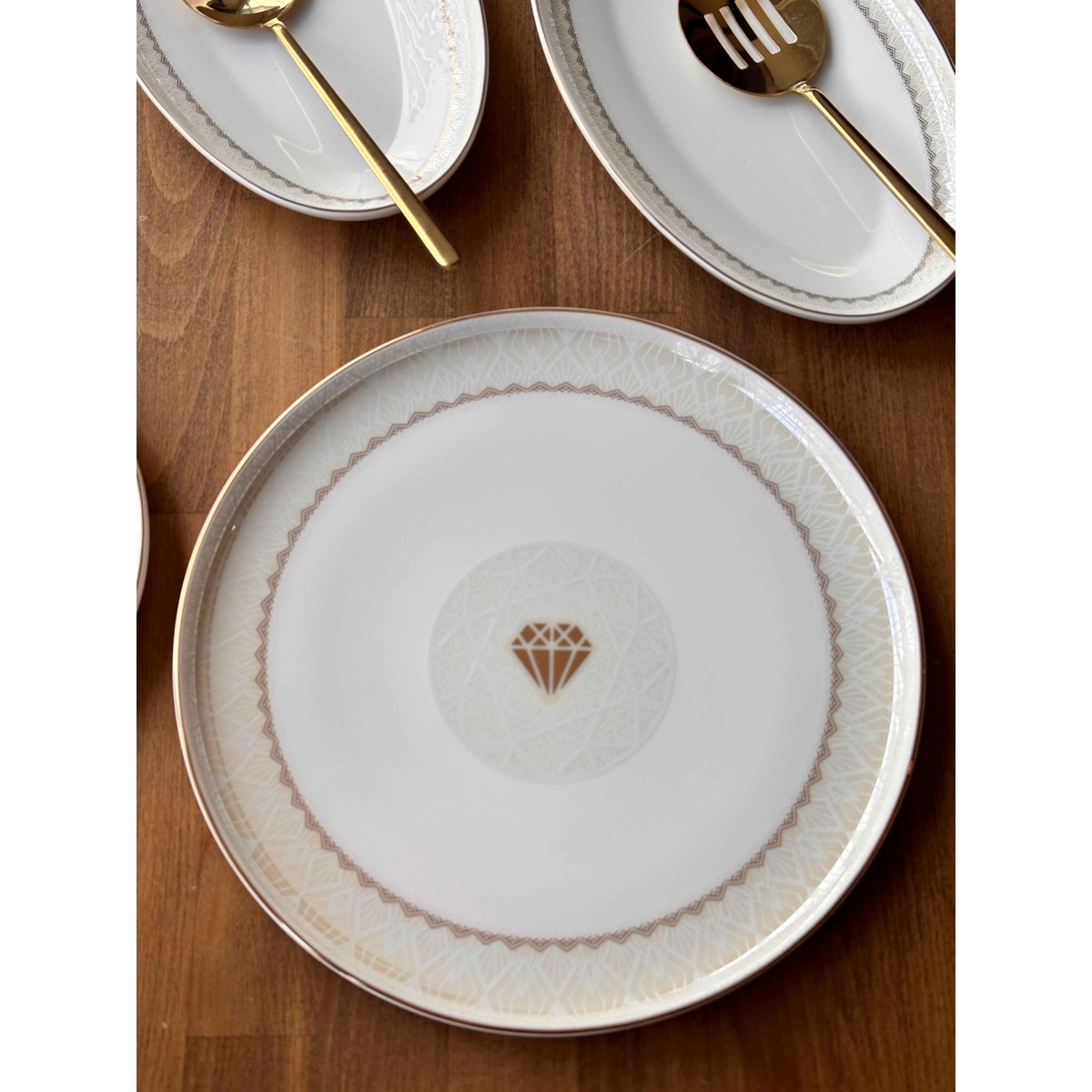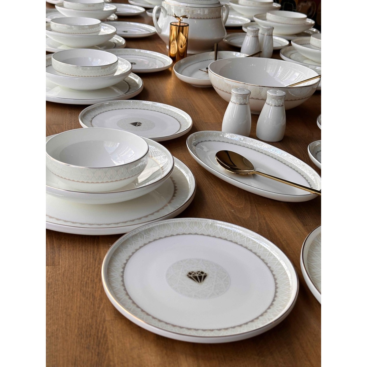 Diamond yemek takımı, ince altın çizgileri ve modern  desenleriyle etkileyici bir seçenek. Krem porselenin göz alıcı duruşu, alt detaylarla mükemmel bir uyum sağlıyor. Bu tasarım, hem günlük kullanım için hem de özel davetlerde sofralarınıza göz alıcı bir dokunuş katacak. Her servis, bu güzel takımla birlikte unutulmaz bir deneyim haline gelecek!