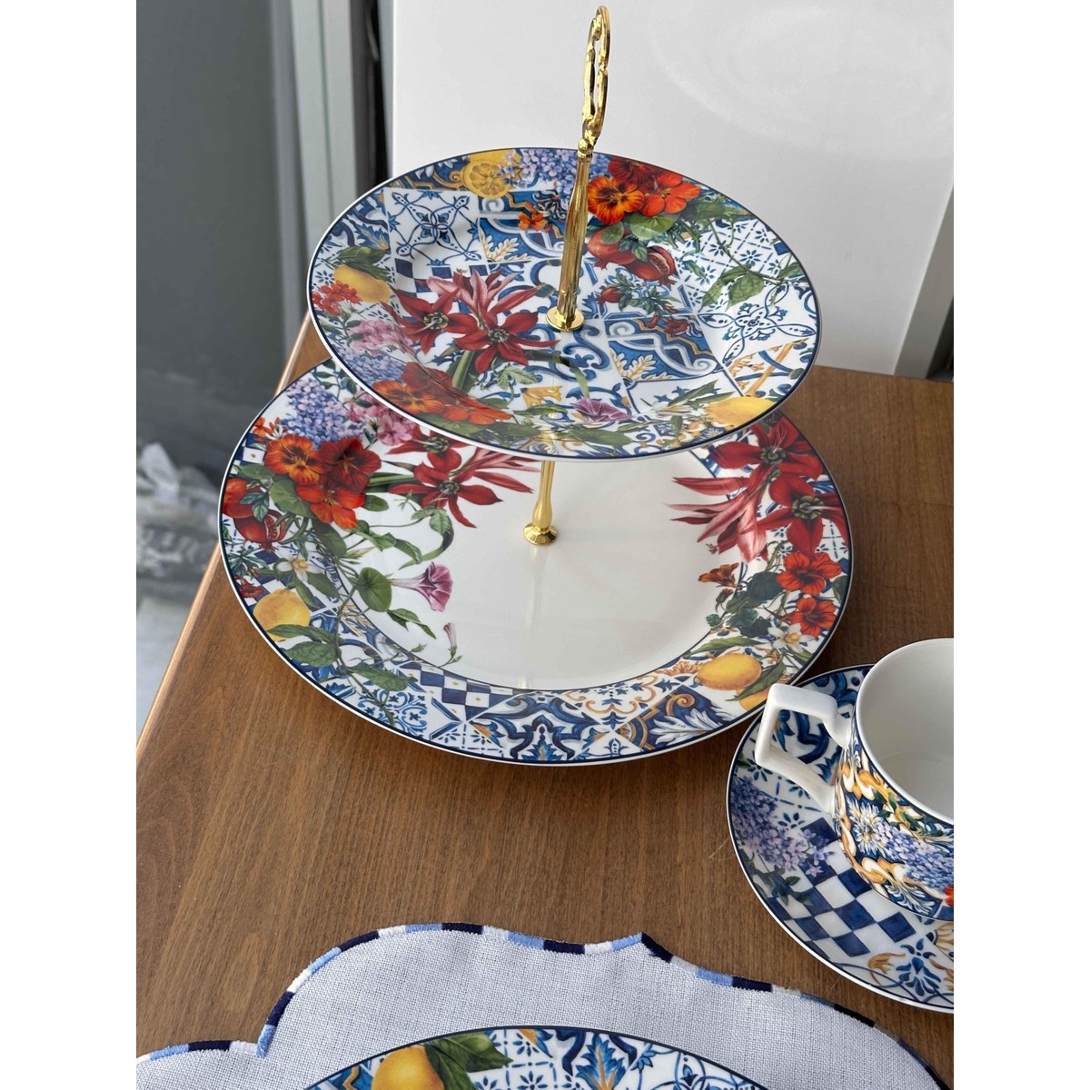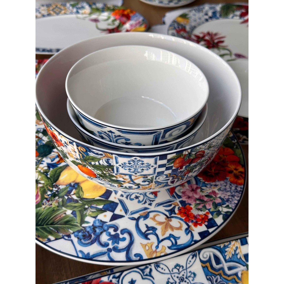 Italy Garden koleksiyonuna ait 6 kişilik 54 parça porselen yemek takımı, beyaz-lacivert dama etnik desenleri nar,limon ve çiçek motifleriyle sofralarınıza doğanın canlılığını taşıyor. Servis tabaklarından kayık tabaklara, fincan setinden kek standına kadar yemek sofralarının tüm ihtiyaçlarını kapsayan bu set, hem günlük kullanım hem de özel günler için idealdir.