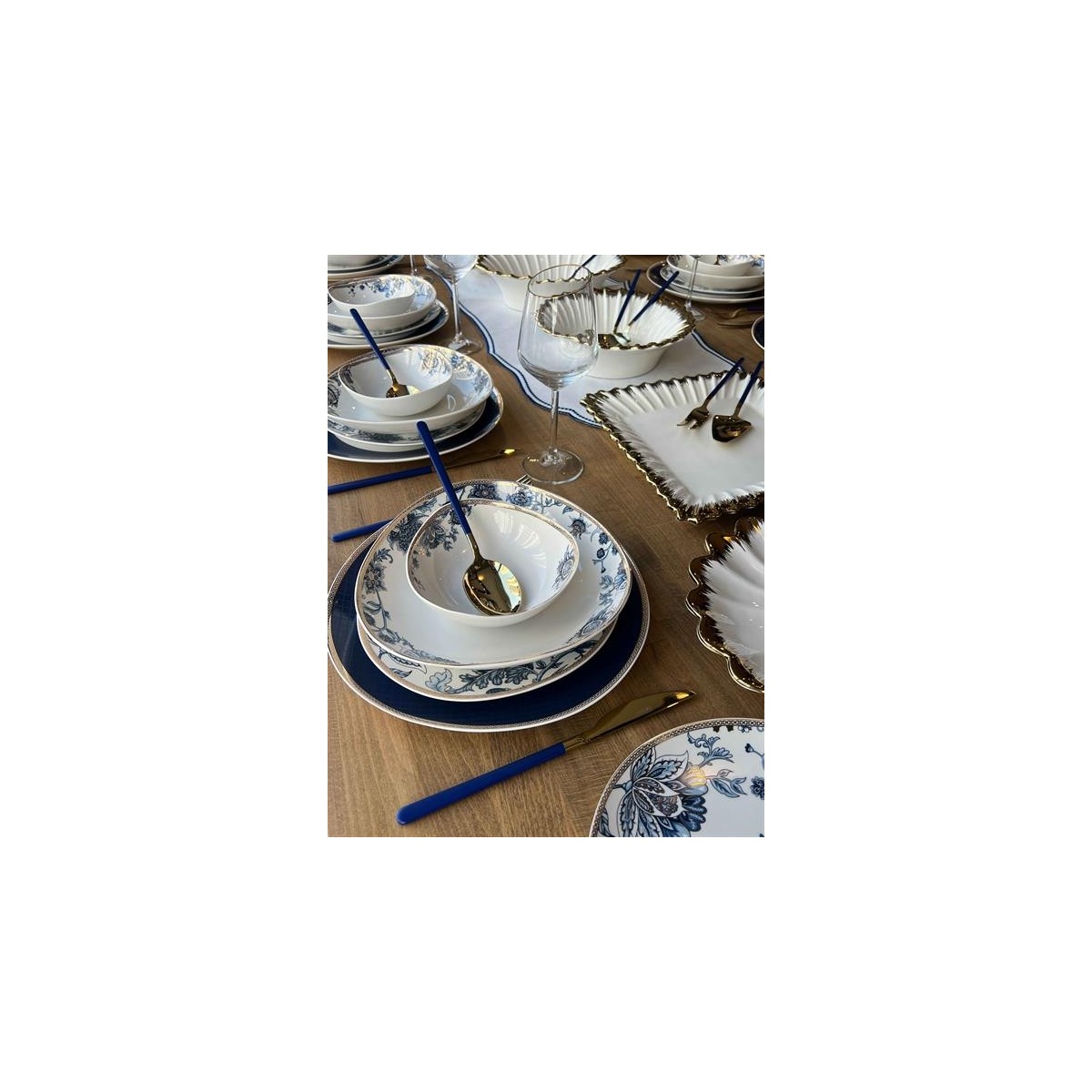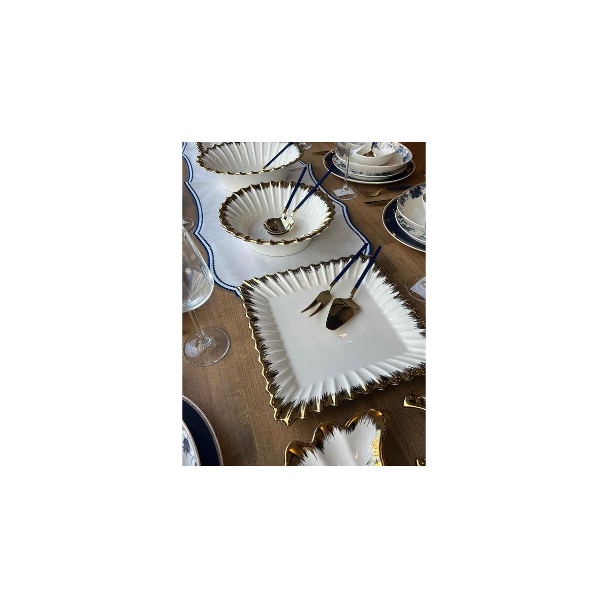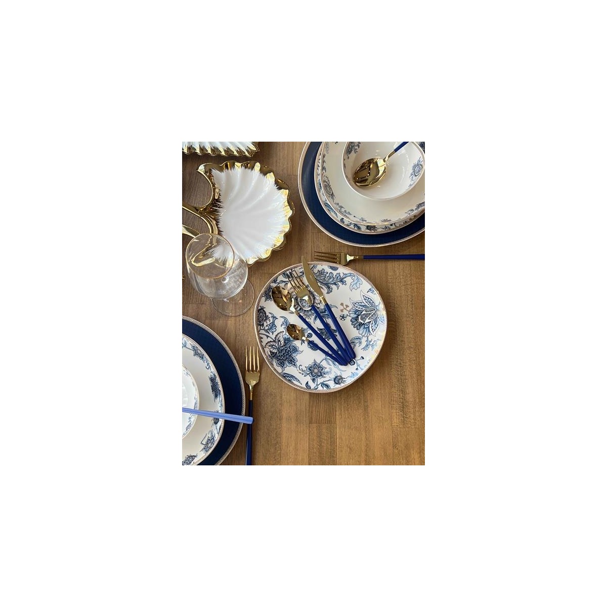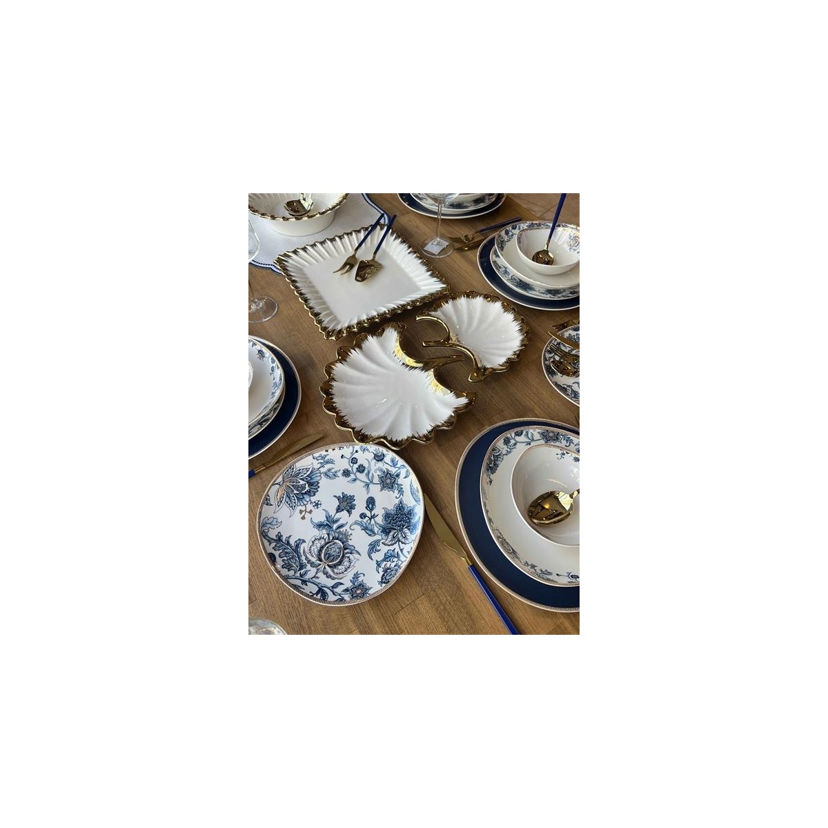 Gold detaylı orta sunumlar ve çatal kaşık takımı sadece elde yıkamaya uygundur.