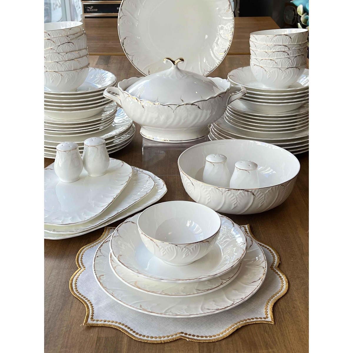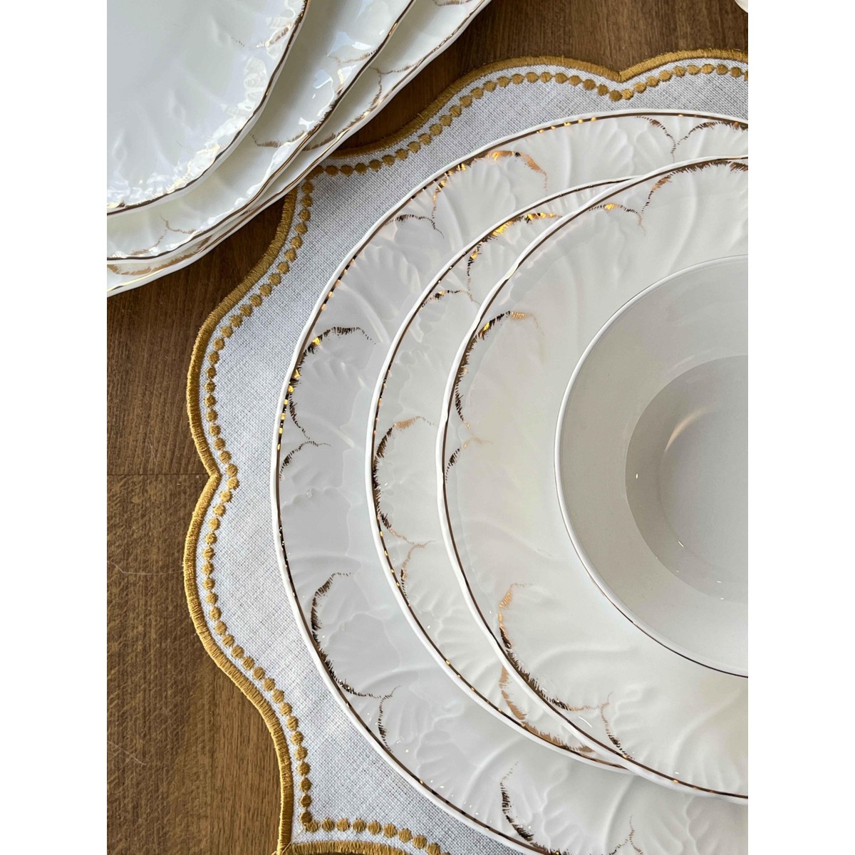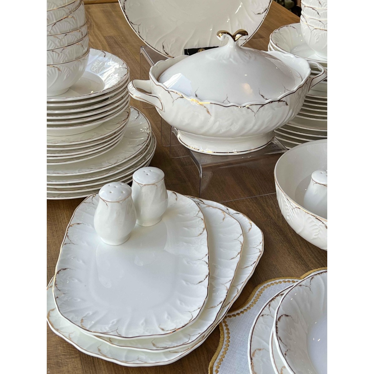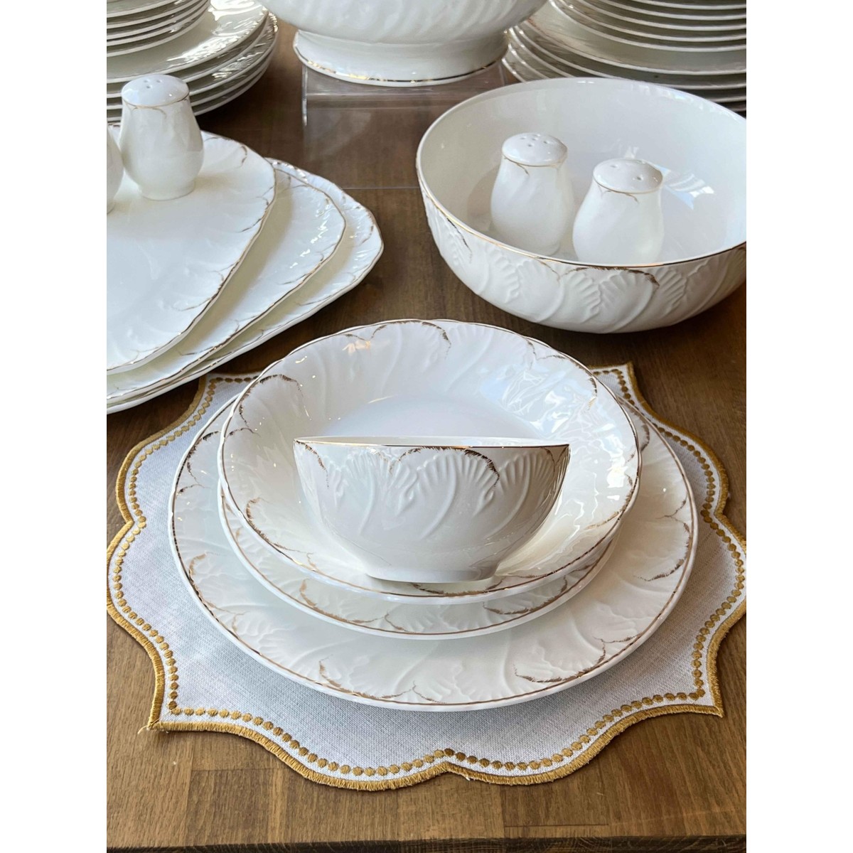 Tıffany Golda yemek takımı, modern çizgileri ve zarif kabartma deseniyle mutfaklarınıza estetik bir dokunuş katıyor. Beyaz porselenin üst kısmı, alttaki detaylarla göz alıcı bir kontrast yaratırken, her yemek servisini unutulmaz kılıyor. Misafirlerinizi etkileyecek şıklıkta bir sunum sunuyor.