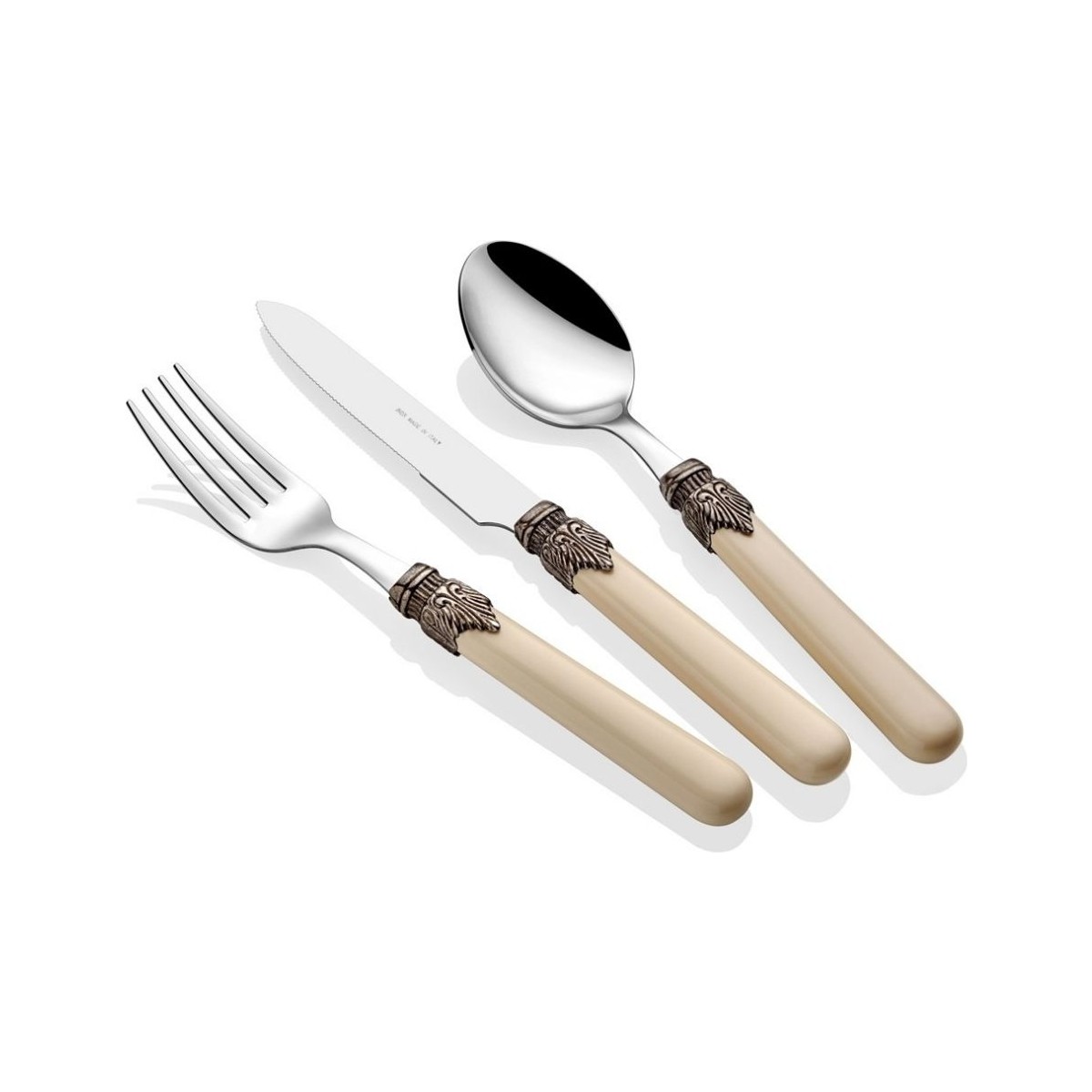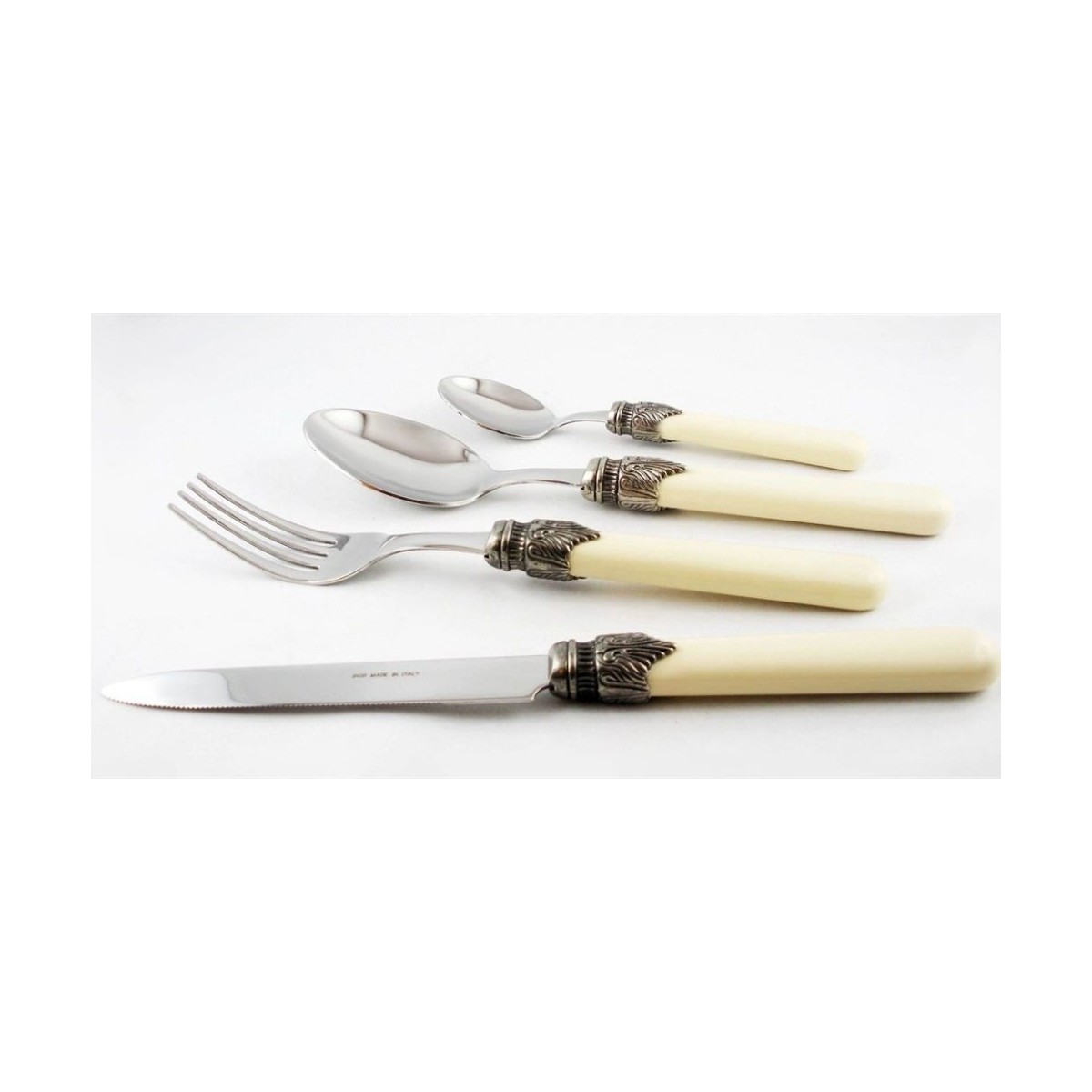 ÜRÜN ÖZELLİKLERİ Materyal: ABS Paslanmaz Çelik: 18/10 Kalınlık: 1,5 MM Yıkama Talimatı: 65° dereceye kadar bulaşık makinesinde yıkanabilir. Kutunun içindekiler: 6 parça yemek çatalı, 6 parça yemek bıçağı, 6 parça yemek kaşığı ve 6 parça tatlı kaşığı %100 İtalyan üretimi