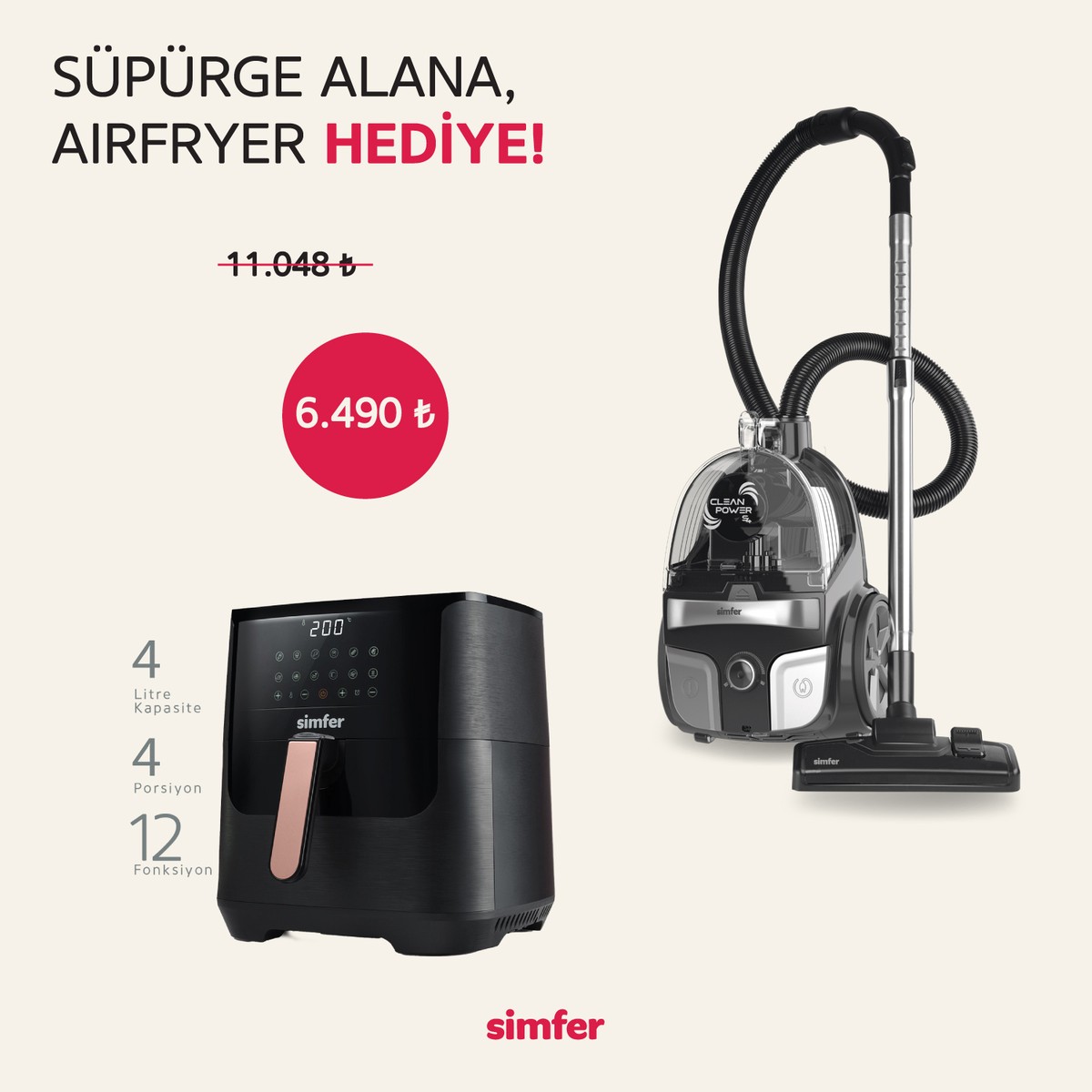 Toz Torbasız Yatay Süpürge Clean Power S4 Gri (4 Litre Smart Dijital Siyah Airfryer Hediye!)