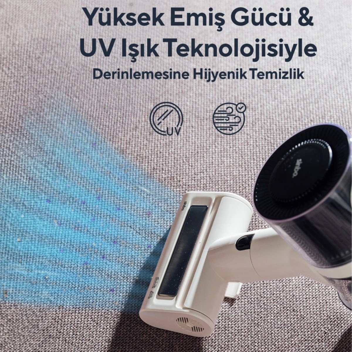 • Aparatlar : UV mite başlık, 2 in 1 toz fırçası, kenar/köşe başlık aparatı, harici şarj edilebilen batarya, adaptör ve duvar askı aparatı