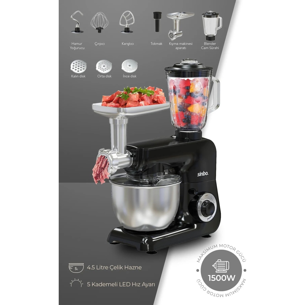 • Aksesuarlar: Hamur Kancası, Karıştırıcı, Çırpıcı