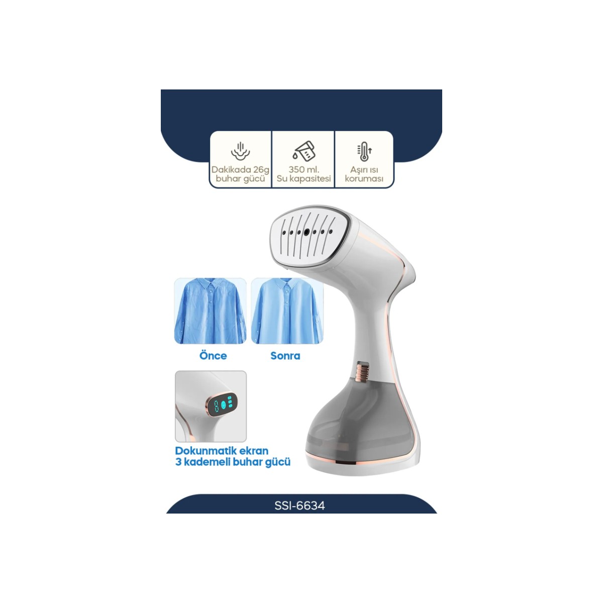SSI-6634 Dikey Buharlı Kırışıklık Giderici – 1640W – Beyaz Üstün performans ve pratik kullanım bir arada! SSI-6634 Dikey Buharlı Kırışıklık Giderici, 1640W gücüyle hızlı ve etkili kırışıklık giderme sağlar. Gelişmiş dokunmatik kontrollü sürekli buhar teknolojisi, giysilerinizde mükemmel sonuçlar elde etmenizi sağlar. 2 farklı buhar modu (güçlü ve hızlı buhar) sayesinde, ihtiyacınıza göre kolayca ayar yapabilirsiniz. Çıkarılabilir 320ml su deposu ile uzun süreli kullanım sağlar. 26g/dakika buhar çıkışı ile kısa sürede kırışıklıkları yok edin ve kıyafetlerinizi tazeleyin. Ergonomik tasarımı ile rahatça kullanabilir, hem evde hem seyahatlerinizde pratik bir yardımcıya sahip olabilirsiniz. Öne Çıkan Özellikler: 1640W güçlü motor, hızlı ve etkili kırışıklık gidermeDokunmatik kontrol ile kolay kullanım2 mod seçeneği ile ihtiyacınıza göre ayarlayın320ml çıkarılabilir su deposu26g/dakika yüksek buhar çıkışıKompakt ve taşınabilir tasarımŞimdi, kırışıklıklarla savaşmaya ve mükemmel görünüme ulaşmaya başlayın!