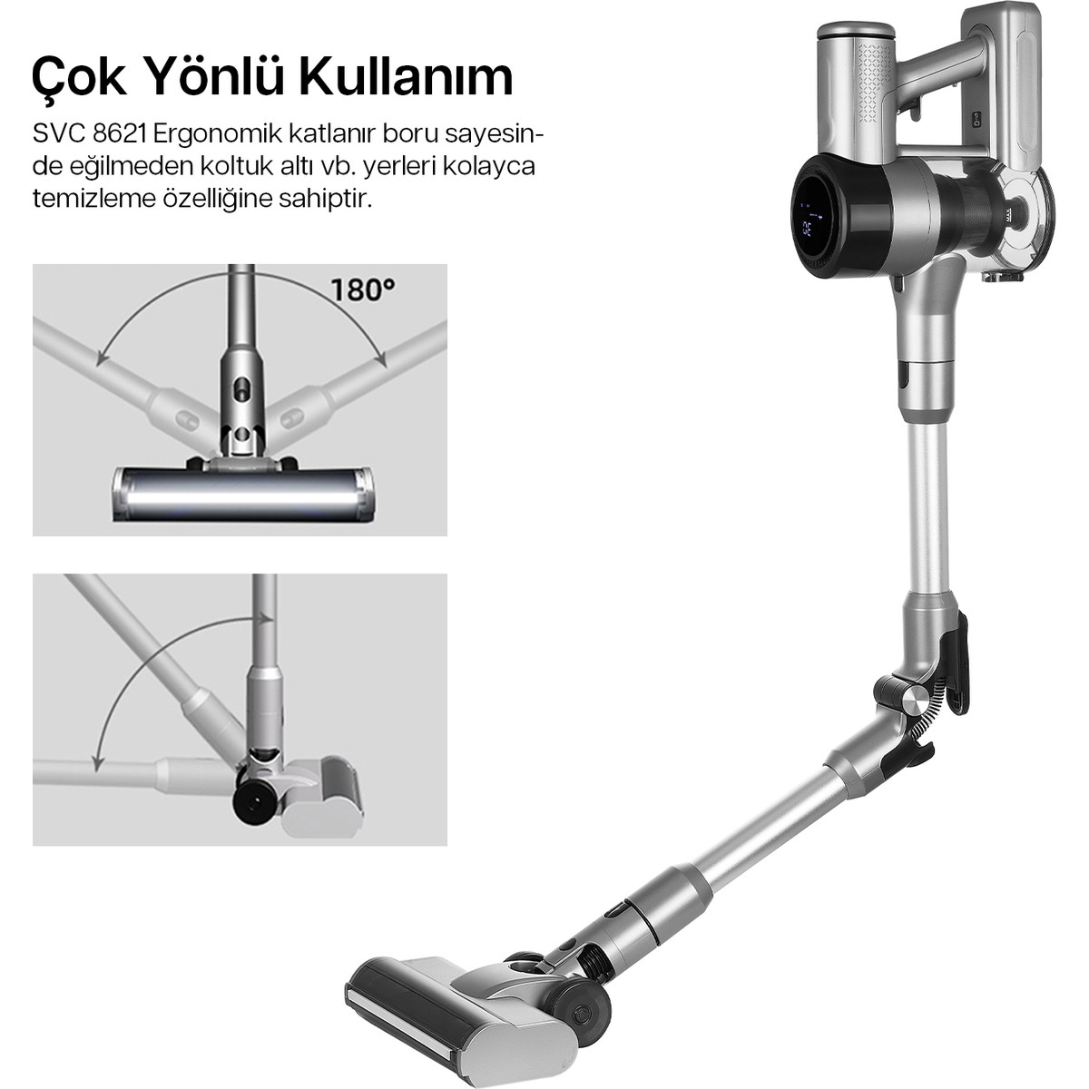 • Ergonomik katlanır boru sayesinde eğilmeden koltuk altı vb. yerleri kolayca temizleme özelliği