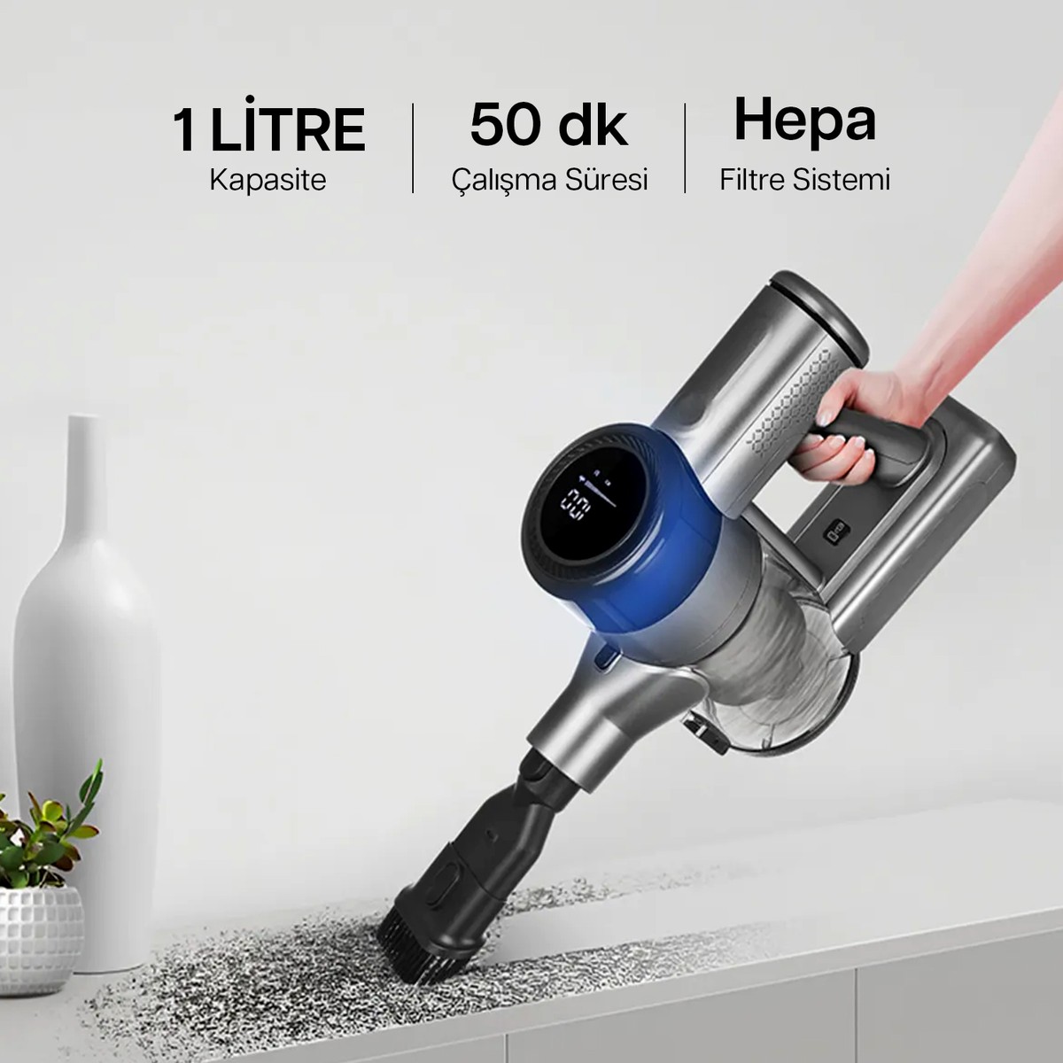 • Aparatlar : 2 in 1 toz fırçası, kenar/köşe başlık aparatı, harici şarj edilebilen batarya, adaptör ve duvar askı aparatı
