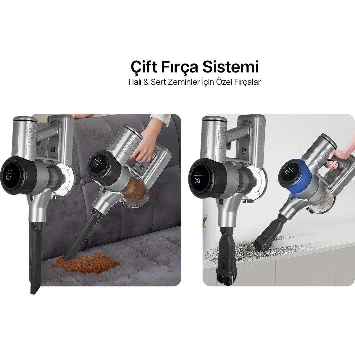 • Farklı zeminler için 2 farklı fırça (halı fırçası-sert zemin parke fırçası)