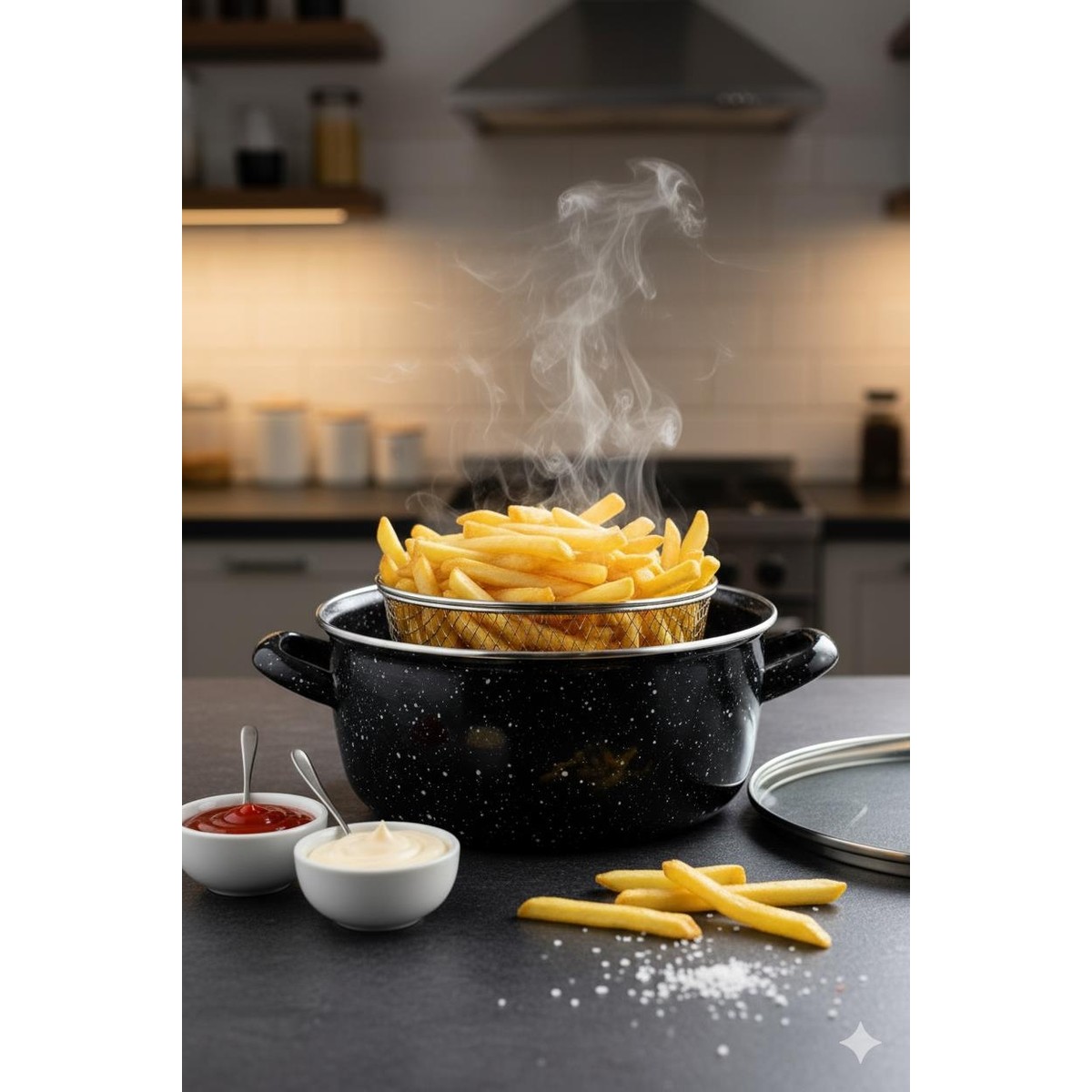 ürün hikayesi: geleneksel emaye dokusunu modern tasarımla buluşturan bu siyah kırçıllı fritöz tencere, hem sağlıklı hem de dayanıklı yapısıyla mutfaklarda vazgeçilmezdir. kızartmalardan haşlamalara kadar farklı pişirme ihtiyaçlarınıza pratik çözümler sunar.