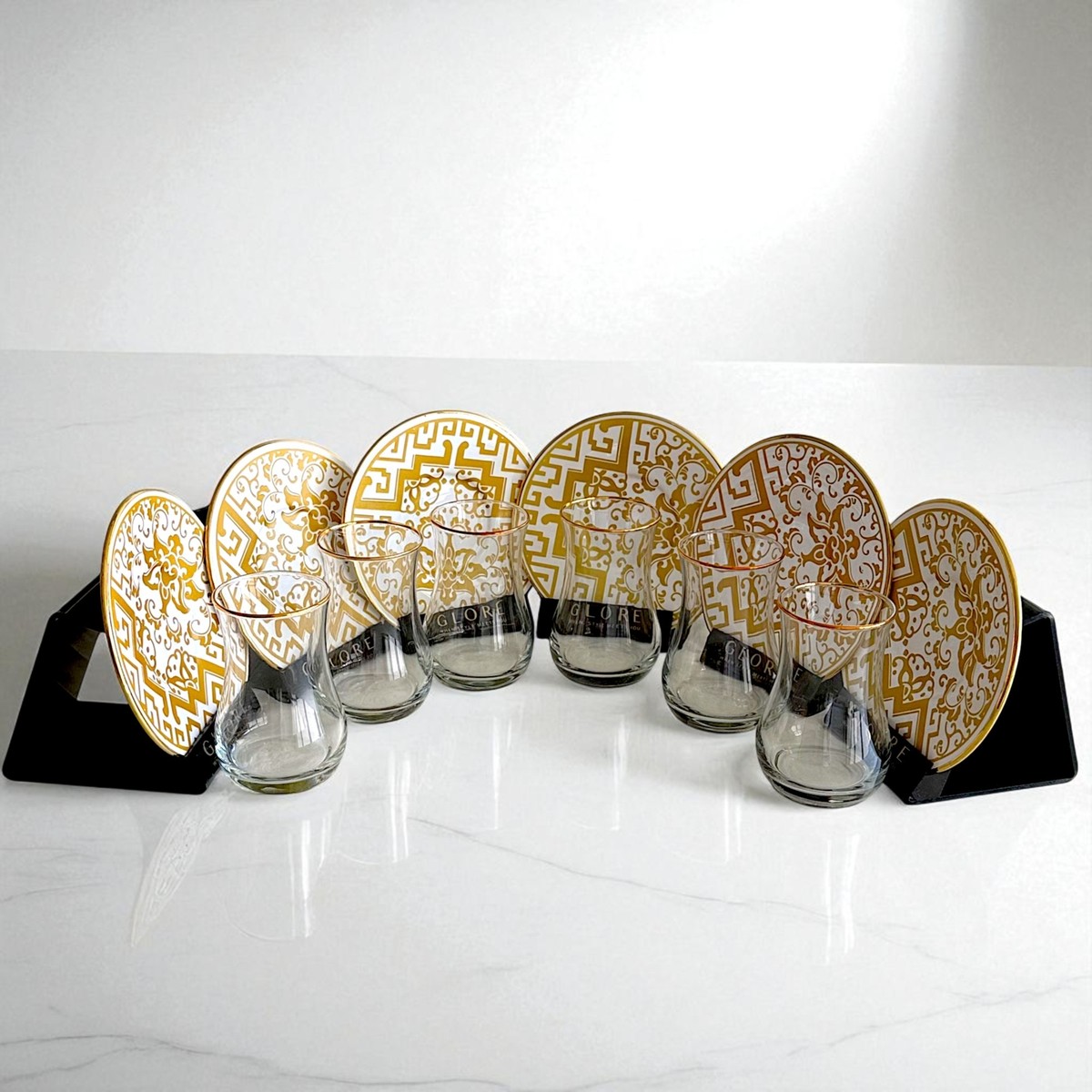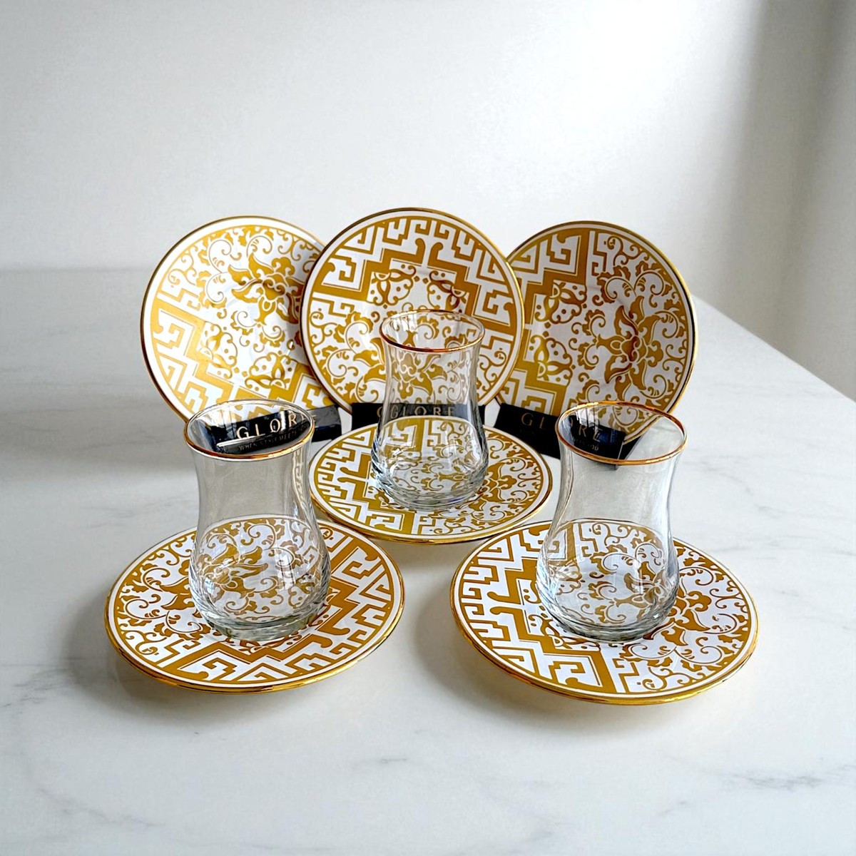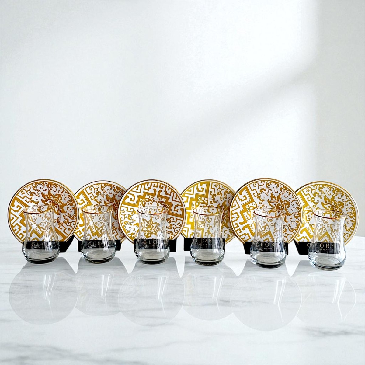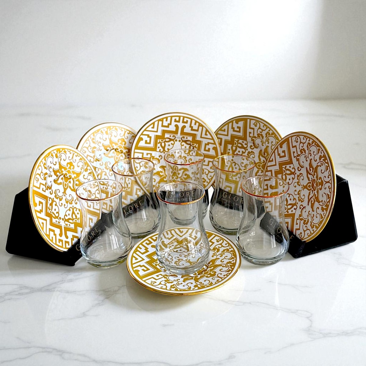 Paket İçeriği: 6 adet cam çay bardağı ve 6 adet altın desenli porselen tabaktan oluşur. Toplam 12 parçadır.