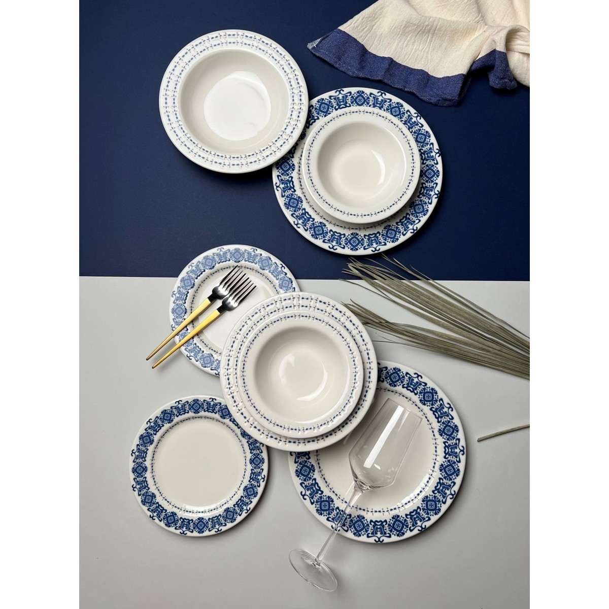 TABAK EVİ Bonsai Blue Garden Porselen Yemek Seti 4 Kişilik 16 Parça TAKIM İÇERİĞİ; 4 Adet Servis Tabağı 24cm, 4 Adet Pasta Tabağı 19cm, 4 Adet Çukur Tabak 21cm, 4 Adet Kase 16cm olmak üzere toplam 16 parçadan oluşmaktadır. Kullanım Talimatı: Ömür boyu desen çıkmama garantisi altındaki desenleri yüksek ısıda fırınlanan bu özel ürünler, porselene parlaklığı veren camsı yüzeyin yani sırın tamamen altına gömülür ve bu yüzden ömür boyu desenlerinizin çıkması mümkün olmaz. Üstün sır ve desen dayanımlı ürünlerimizi, gönül rahatlığı ile bulaşık makinelerinde kullanabilirsiniz.