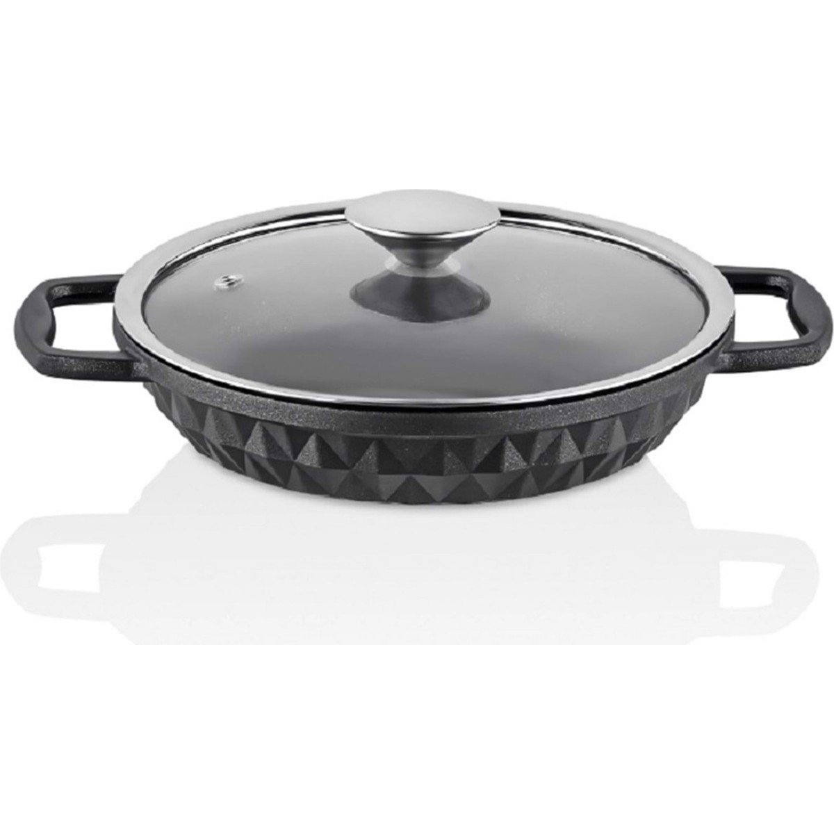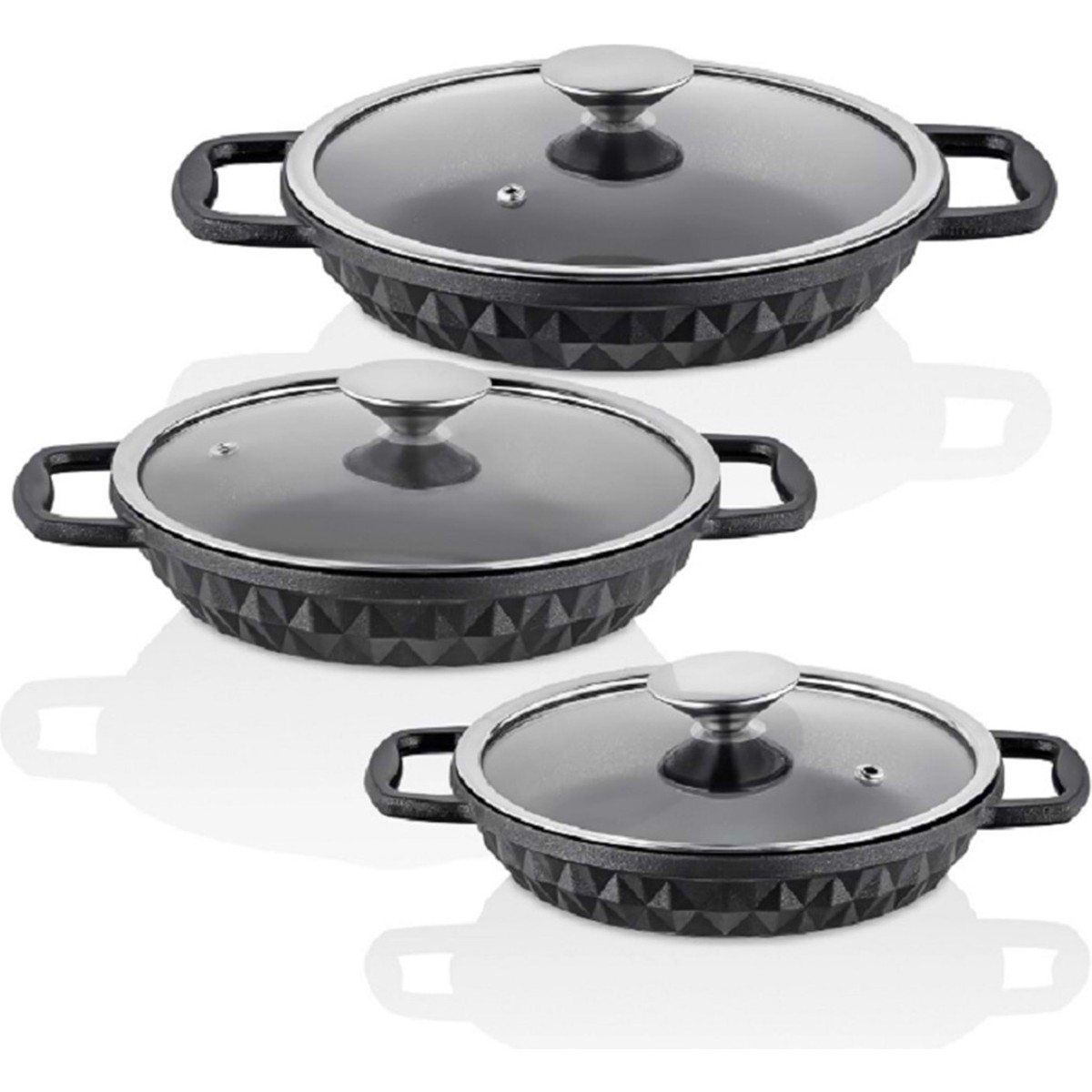 Taç Bella Döküm Cam Kapaklı 3’lü Sahan Set Siyah, hem şıklığı hem de fonksiyonelliği ile mutfaklarınızda fark yaratacak. Set, farklı boyutlarda üç adet sahan içerir ve her biri cam kapaklıdır. İşte setin detayları: