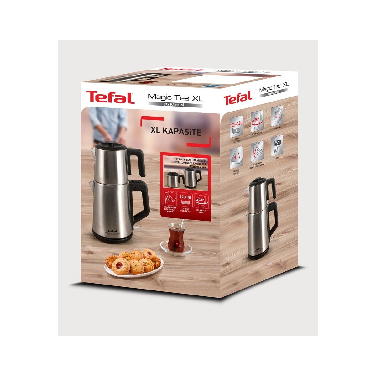 Tefal Magic Tea XL Çay Makinesi Inox Tüm ailenizle çayınızın tadını çıkarın! Tefal Magic Tea XL Çay Makinesi Inox’da 1,2 L çaydanlık ve 1,8 L su ısıtıcısı bulunur. Yüksek kapasitesi sayesinde aileniz, misafirleriniz veya ofis arkadaşlarınız ile çayınızın tadını çıkarabilirsiniz. Sıcak tutma fonksiyonu ile tekrar tekrar çay demleme zahmetine son veren büyük kapasiteli çay makinesi, su ısıtıcısı olarak kullanılabilir ve dayanıklı paslanmaz çelik gövdesi ile uzun ömürlüdür. Ürün Özellikleri