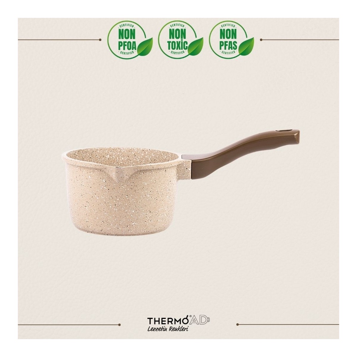 Görüntüsü, malzemesi çok kaliteli. Thermoad markasından tencere, tava ve sahan da almıştım hepsi çok kaliteli çıktı ve kaplaması bozulmadı.