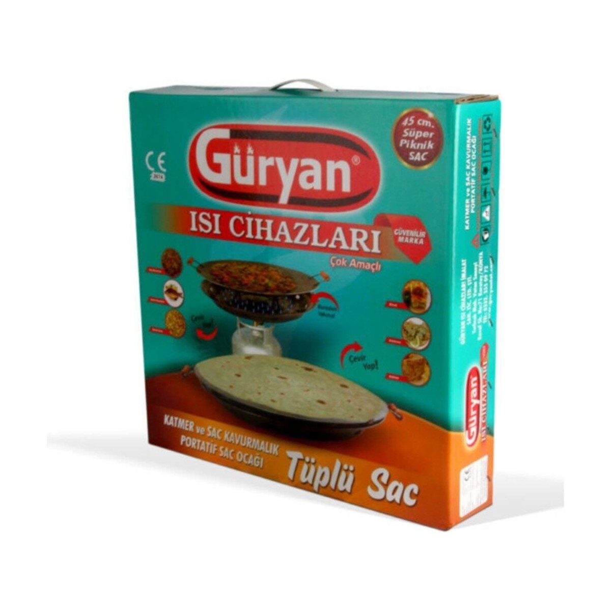 Küçük tüp üzerine takılarak hem gözleme hemde saç kavurma yapmak için kullanabileceğiniz çok amaçlı portatif sac. İster piknikte isterseniz evde çok rahat kullanın… Gözleme, sac böreği, ekmek, yufka ve sac kavurma yapmak için ideal üründür. Marka: Güryan Ürün Özellikleri Çap: 45 cm 1,50 mm siyah kalın sac Elektro Statik boya kaplama Kutu ambalajlı, yer kaplamayan sökülebilir musluk TSE belgeli gaz muslukları kullanılmaktadır. Ce belgelidir Ürünlerimiz 1. sınıf malzemelerden üretilmiş olup, dayanıklılık ve şık görünüm esas alınmıştır.Diğer boyutlardaki katmer ve yufka saclarımız için mağazamızı ziyaret ediniz. Ürün CE belgeli taşınabilir ve çanta kutuludur. TÜP FİYATA DAHİL DEĞİLDİR.