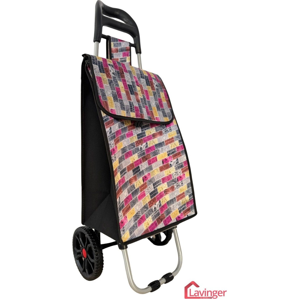 Göz alıcı çok renkli tasarımıyla dikkat çeken bu büyük tekerlekli pazar arabası, alışverişlerinizi kolaylaştırmak için ideal bir seçimdir.