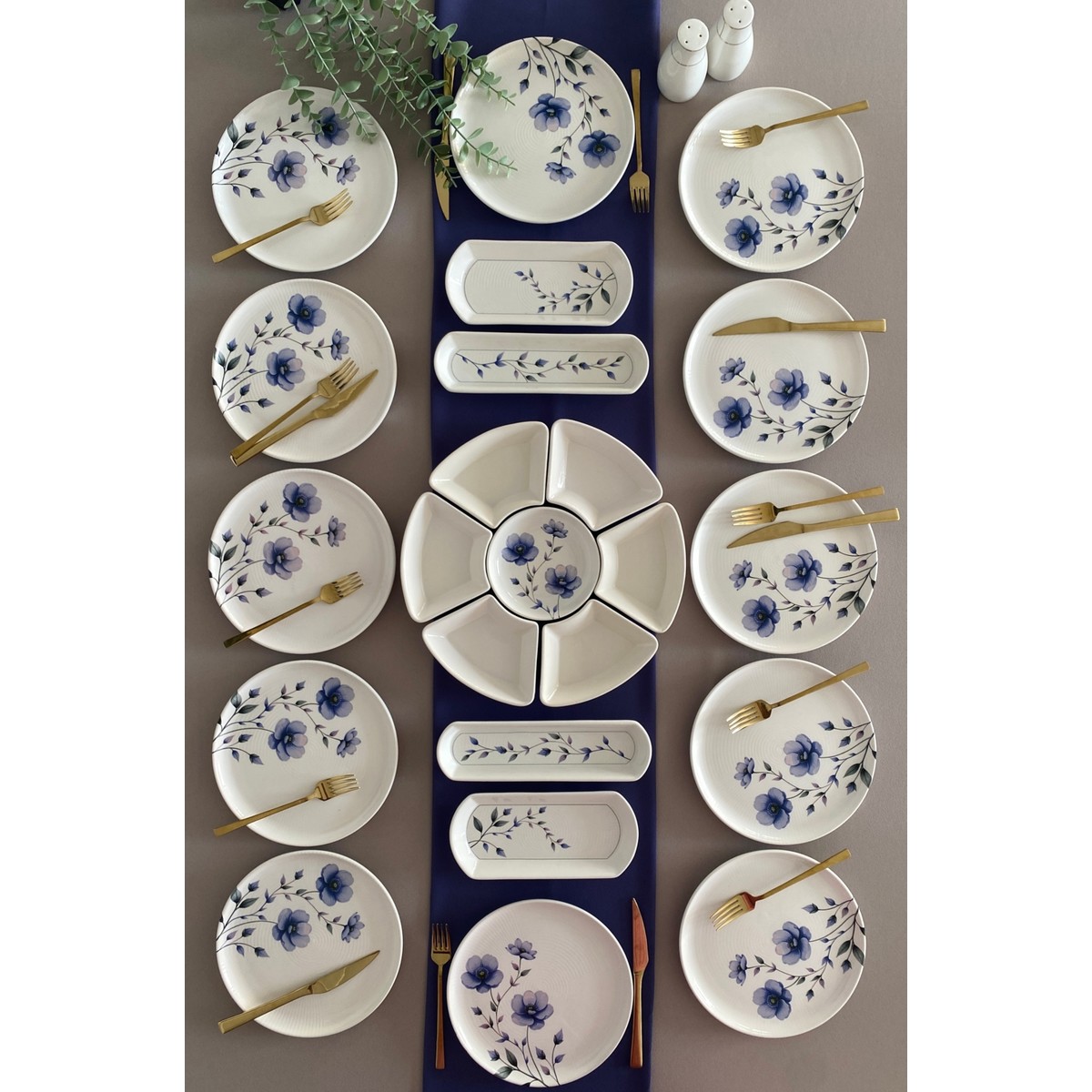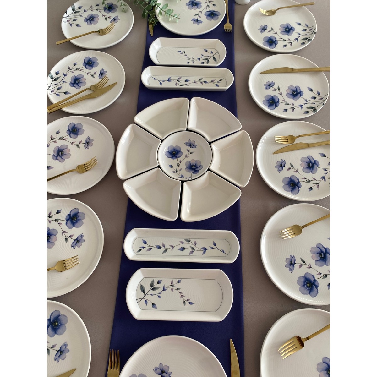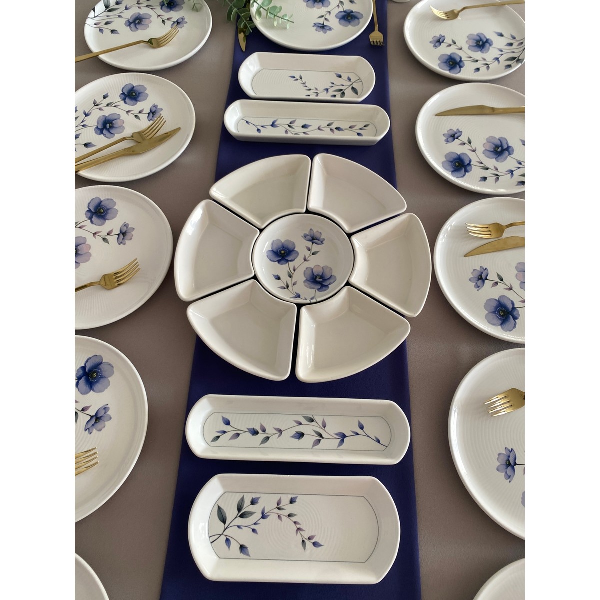 12 adet 20 cm servis tabağı *6 adet üçgen kahvaltı tabağı *1 adet yuvarlak çerezlik *2 adet küçük oval tabak *2 adet zeytinlik **Kırık ürün garantimiz vardır.