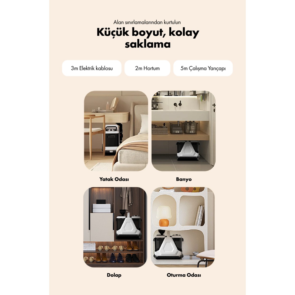 • Kablo derdi yok: 3 metrelik güç kablosuyla priz aramadan geniş alanlarda çalışır.