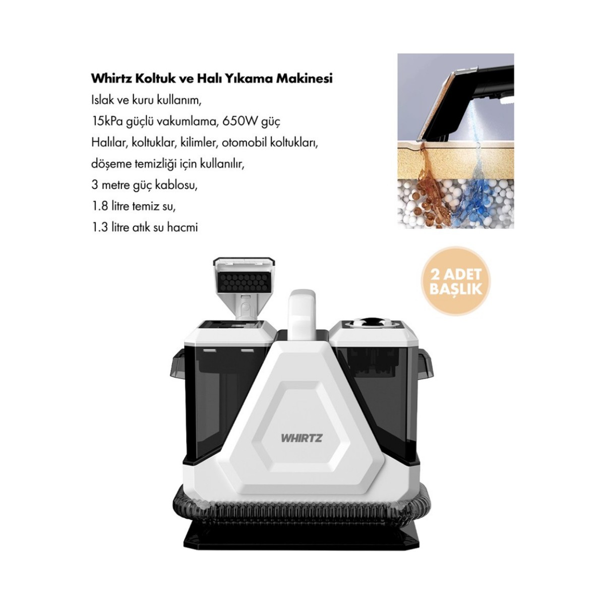 Yüksek emiş gücü (≥15kPa) Islak ve kuru kullanım Kolay taşınabilir, kompakt tasarım Koltuk, halı ve araç için ideal Zaman ve servis parası tasarrufu! Siz sadece düğmeye basın, gerisini Whirtz halletsin.