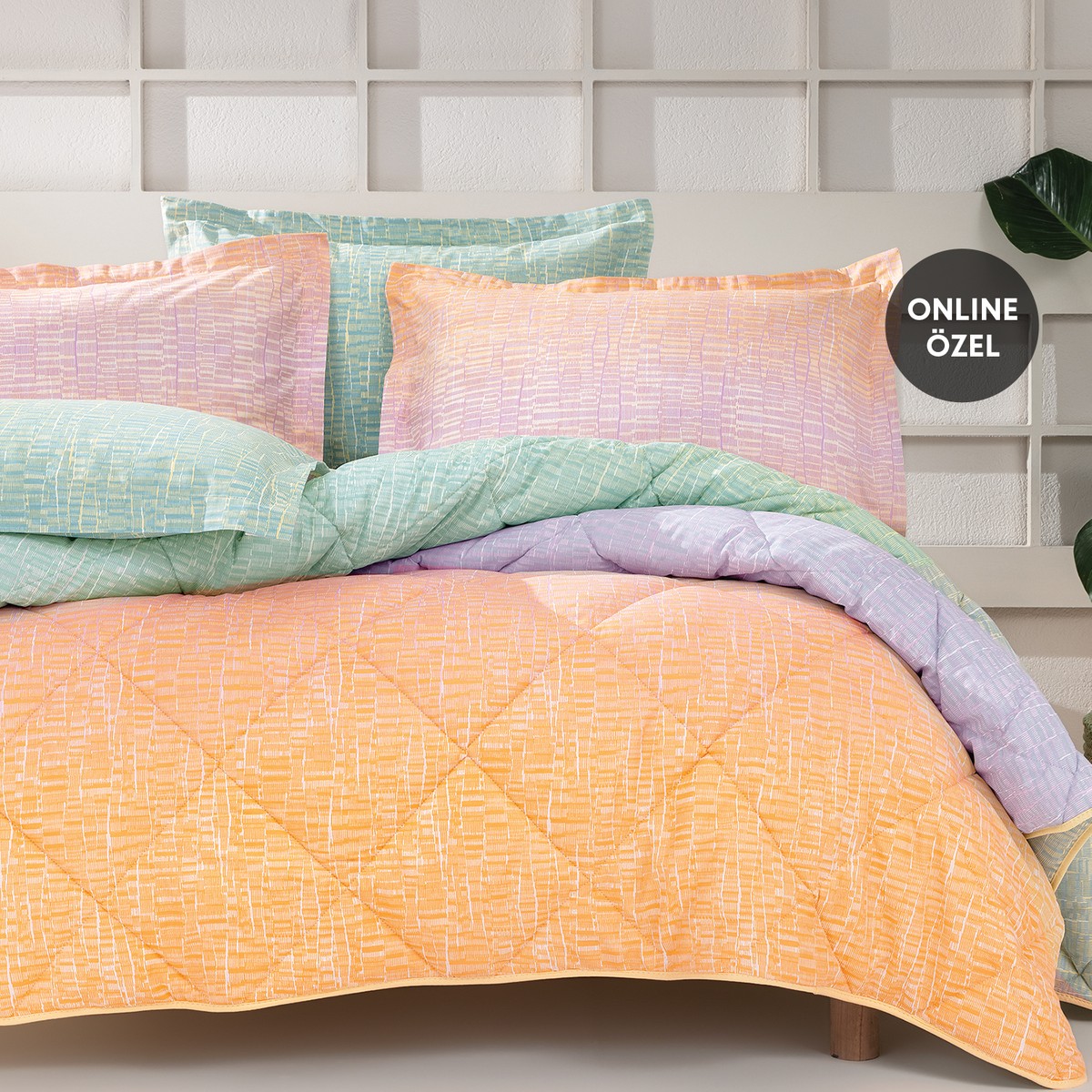 Ürün renk olarak çok güzel, kumaşı biraz fazla gözenekli geldi. Yataktan yorganı bir tık daha dolgulu beklerdim. Onun dışında severek kullanıyor kızım.