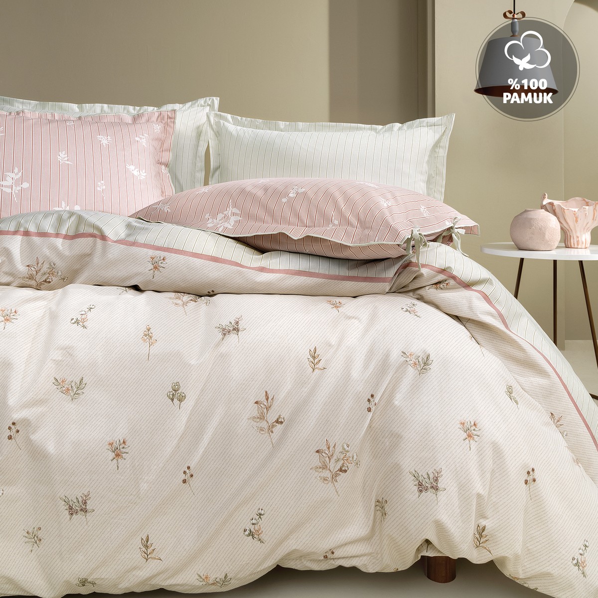 %100 pamuk kalitesiyle rahat bir uyku deneyimi sunar.; ; Pamuk Konforu ; Çift taraflı kullanım avantajı ile farklı görsel etkiler yaratmaya olanak sağlar.; ; Terletmeyen %100 Pamuk kumaş ; Çift yönlü kullanım avantajı ; Kumaş Dokuması: %100 Pamuk ; Dokuma Sıklığı: 52 Tel ; Ürün İçeriği ve Ölçü Bilgisi: Nevresim: 200×220 cm (1 Adet) Yastık Kılıfı: 50×70 cm (2 Adet) ; Yıkama Talimatı: ; 30 derecede yıkanması tavsiye edilir.; ; Ağartma yapılmamalıdır.; ; Orta ısıda ütülenebilir (Max 150 ) ; Tamburlu kurutma yapılmamalıdır.; ; Kuru temizleme uygulanmamalıdır.