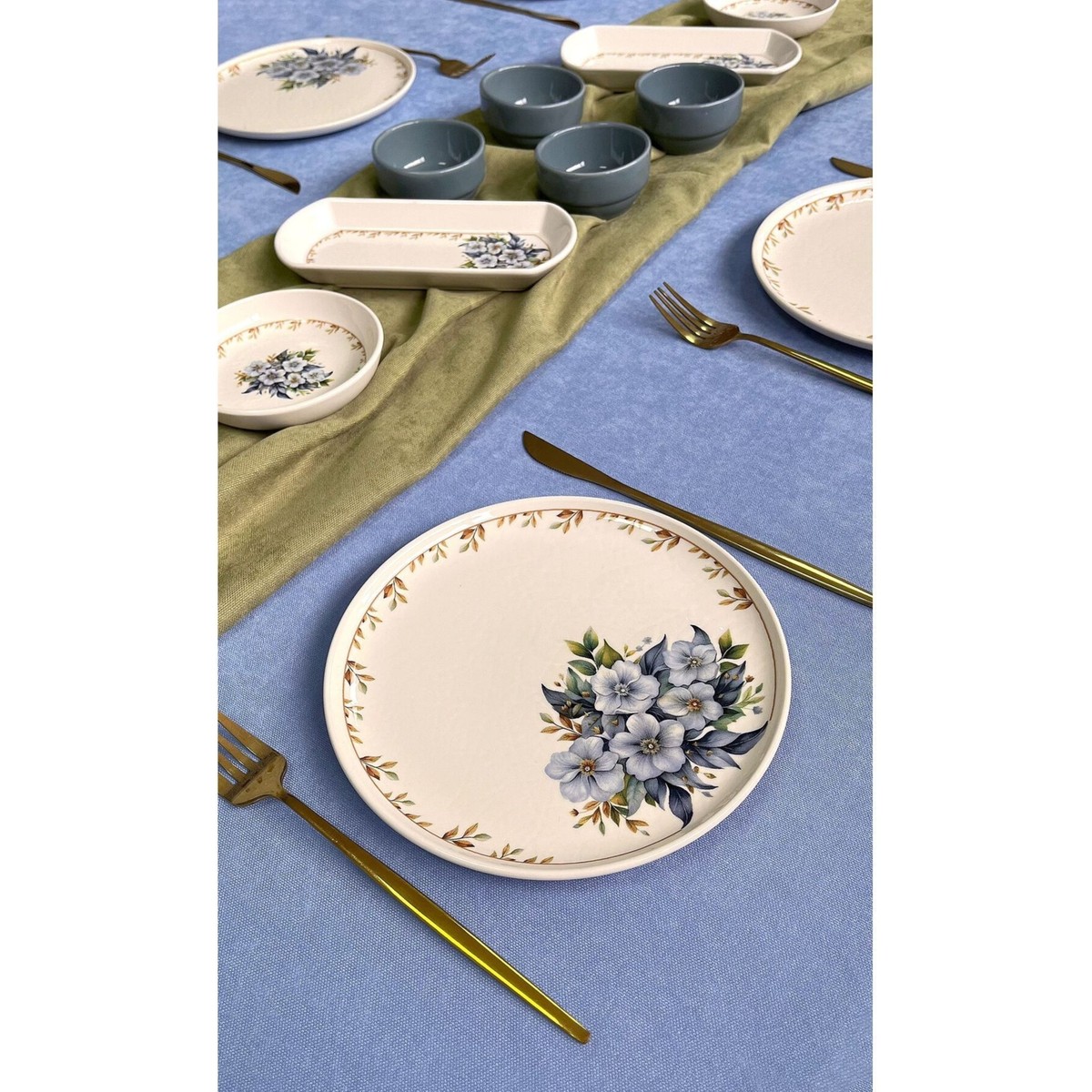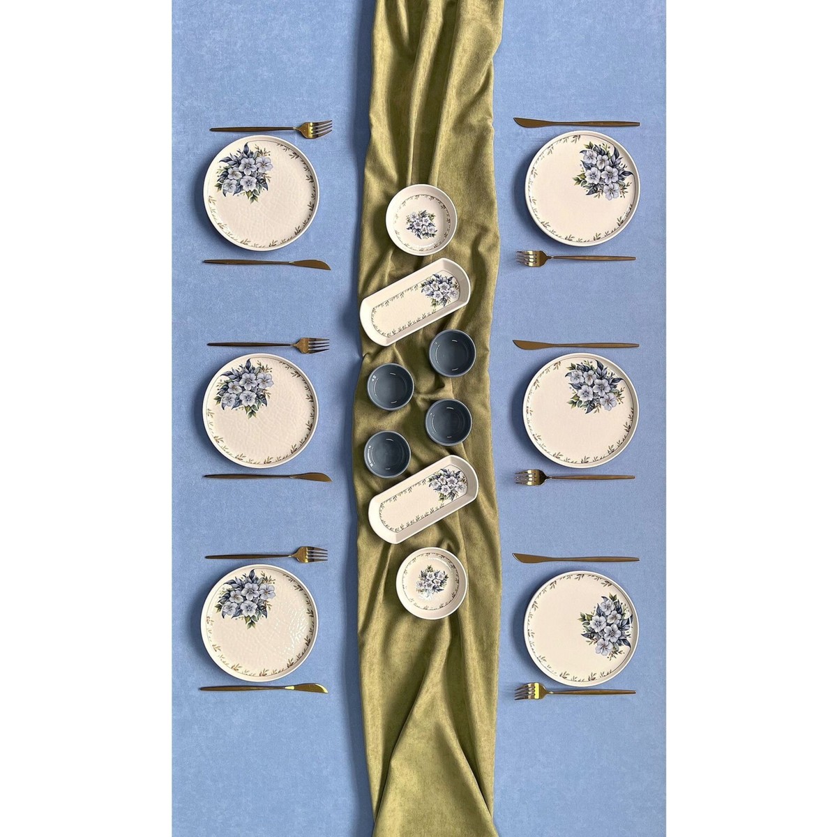 Yiğit Seramik Züccaciye Yediveren Çiçeği 14 Parça Kahvaltı Takımı 6 Kişilik Mavi Desenli