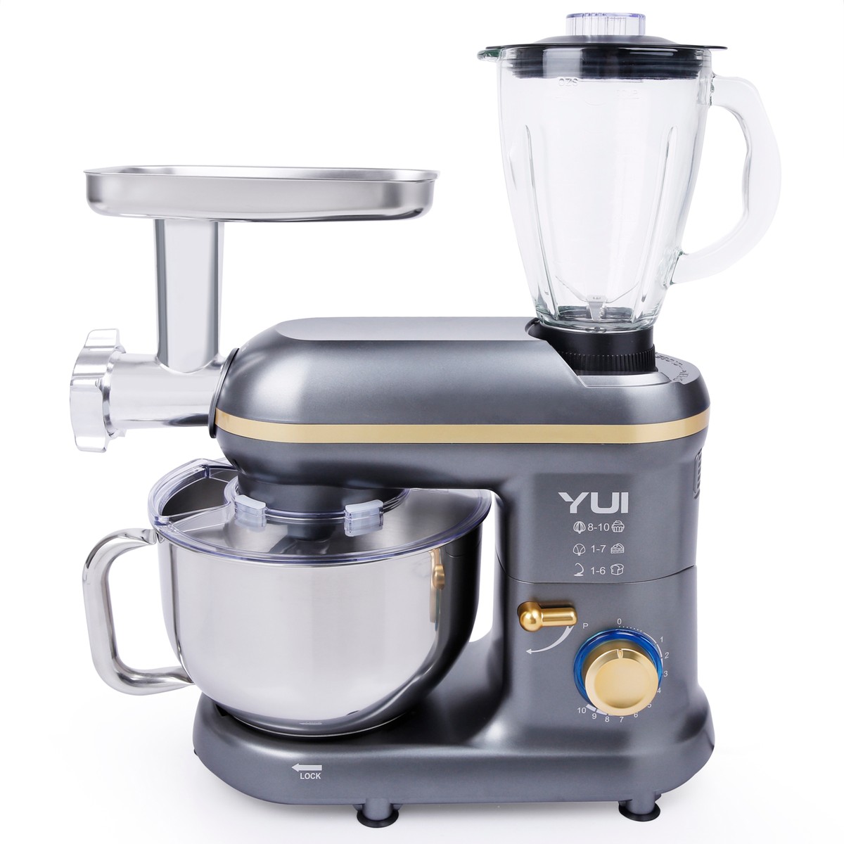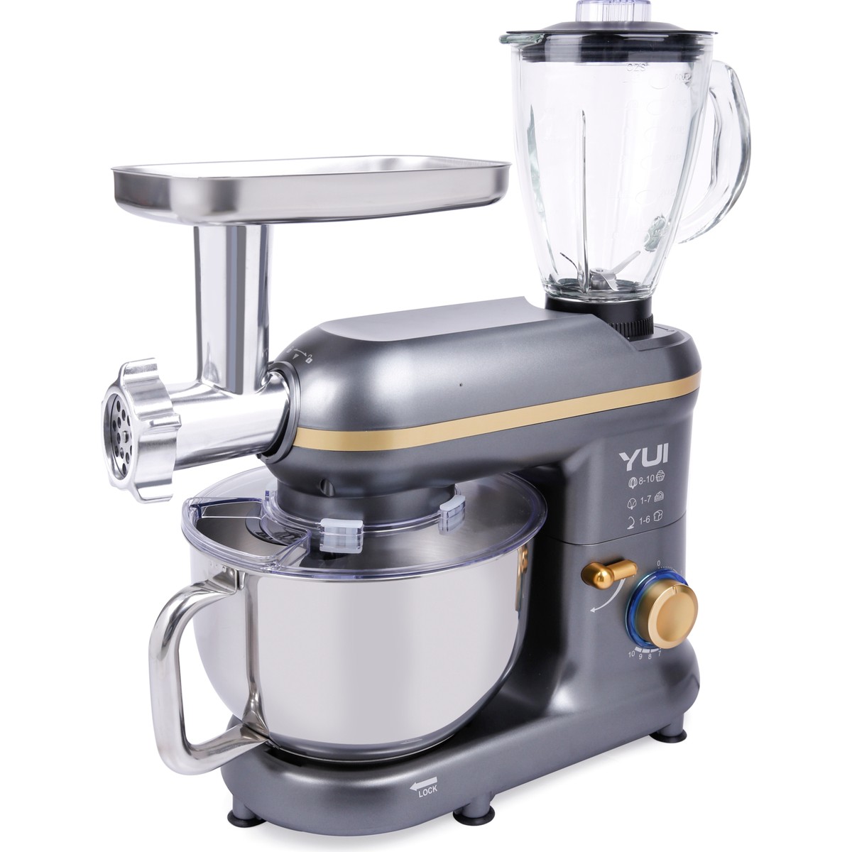 Yui M120 Multi-Fonksiyonel 3’ü Bir Arada Stand Mikser Kıyma Setli ve Blender Özellikli Koyu Gri/gold