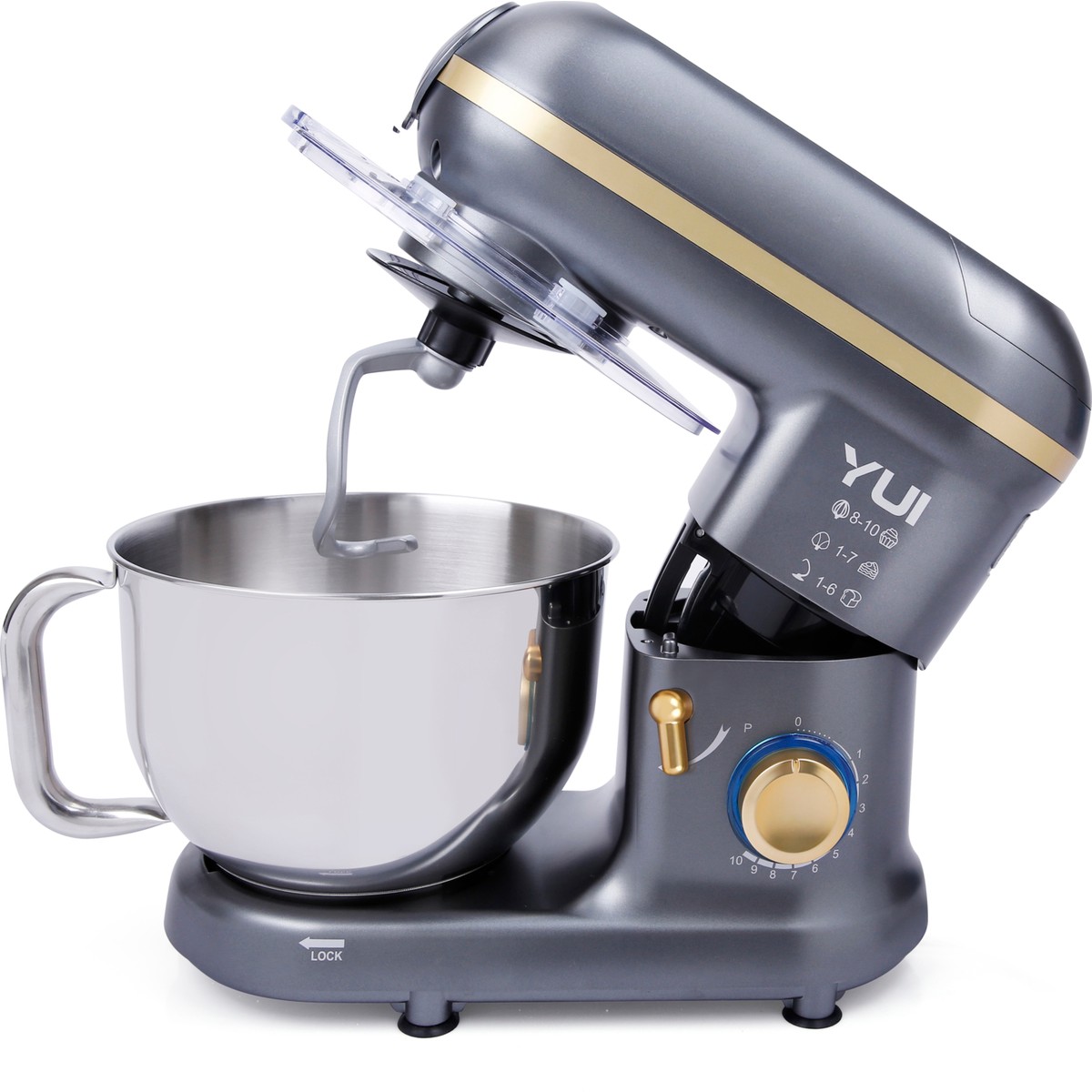 Yui M-120 stand mikser, 6 farklı hız kademesinde kullanılabilecek 3 ayrı başlığa sahiptir. Çırpma, karıştırma ve yoğurma başlığını çeşitli yiyeceklerde kullanabilirsiniz.