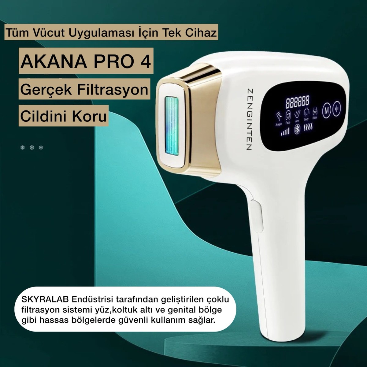Zenginten Pro 4, 999.999 atımlı buz başlıklı lazer epilasyon cihazı, benzersiz tasarımı ile bikini, vücut, yüz, kol ve bacak bölgelerinde etkili epilasyon sunar. Bu cihaz, güvenilir ışık teknolojisiyle uzun süreli tüy azaltma sa ğlar. Buz başlığı sayesinde cildinizi serin tutarken, ayrı modlarıyla her bölgeye özel bakım sunar. Hem pratik hem de konforlu bir epilasyon deneyimi için Zenginten Pro 4 tercihiniz olabilir.