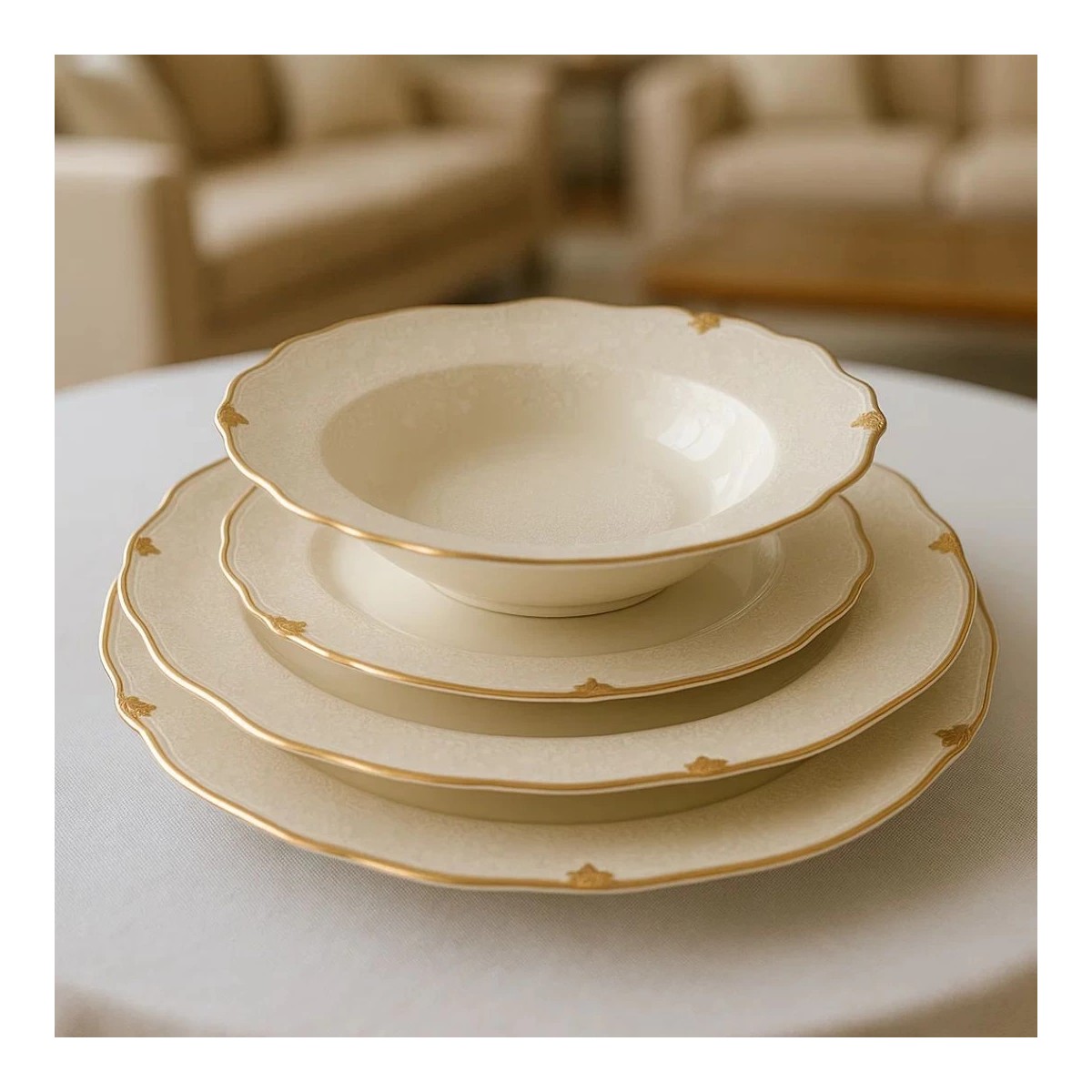 Her bir tabak, pürüzsüz krem zemin üzerine özenle işlenmiş altın yaldız süslemelerle bezenmiştir. Dalgalı kenar hatları, dört köşede yer alan zarif altın motiflerle buluşarak sofistike bir çerçeve oluşturur. Tabak yüzeyindeki kabartmalı desenler ise hem dokunsal bir zenginlik sunar hem de ışık yansımalarıyla sofranızda ışıltılı bir atmosfer yaratır.